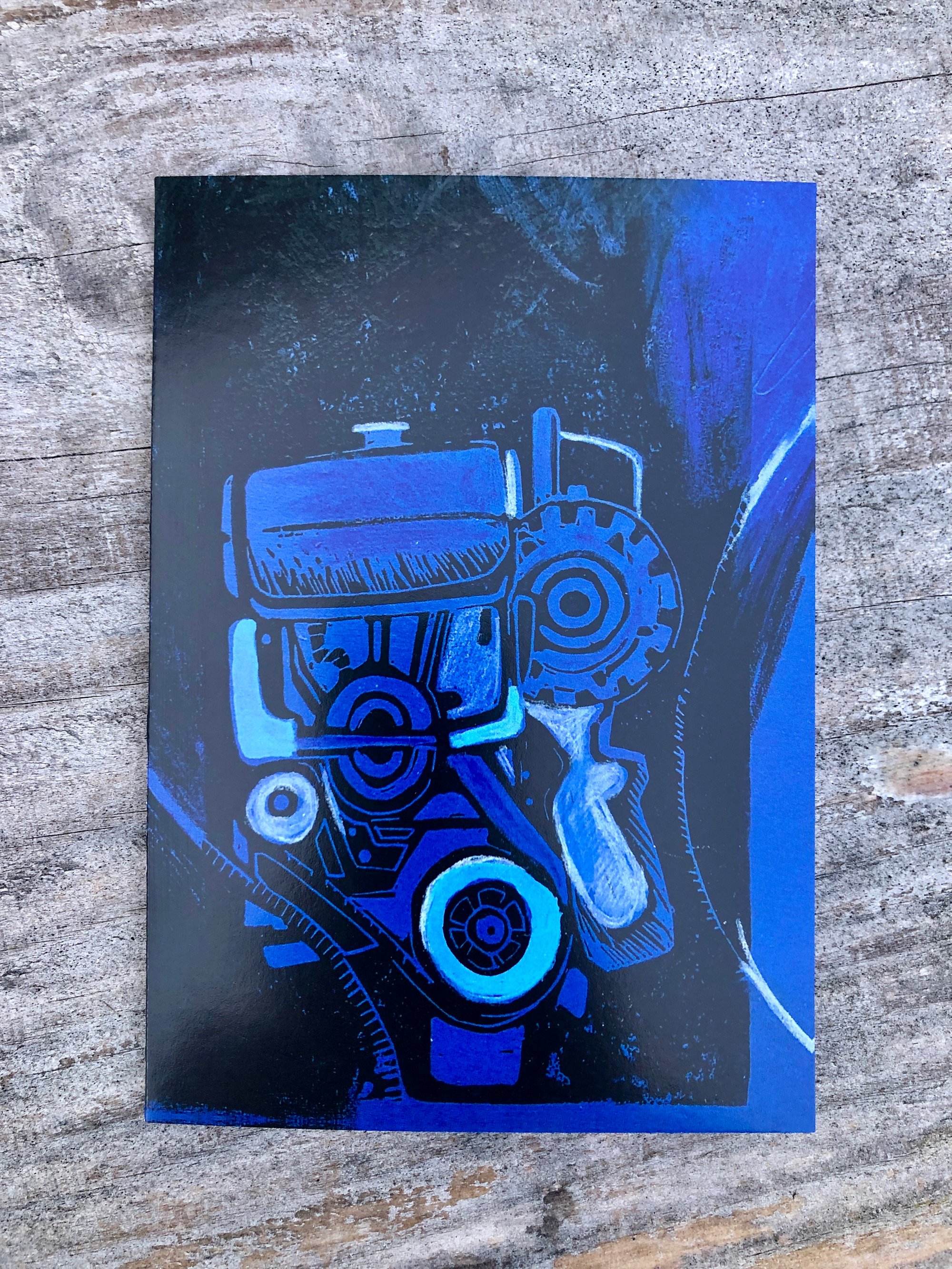This is a card of a Lino Print image of a 6 cylinder Ford marine engine aboard the former fishing boat now work boat Harvest Lilly.
