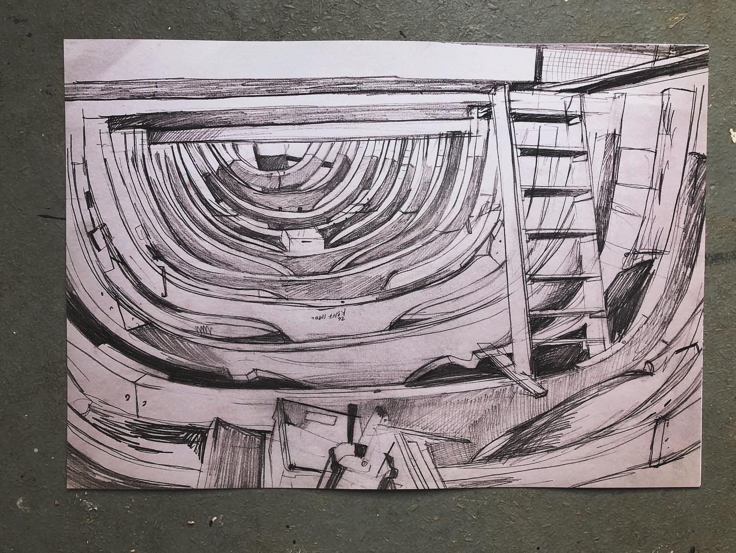I drew extensively at the yard during the restoration of the boat and many of these drawings are collected in the book I made 2023 called Drawn Lines. This is an image from the book.